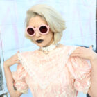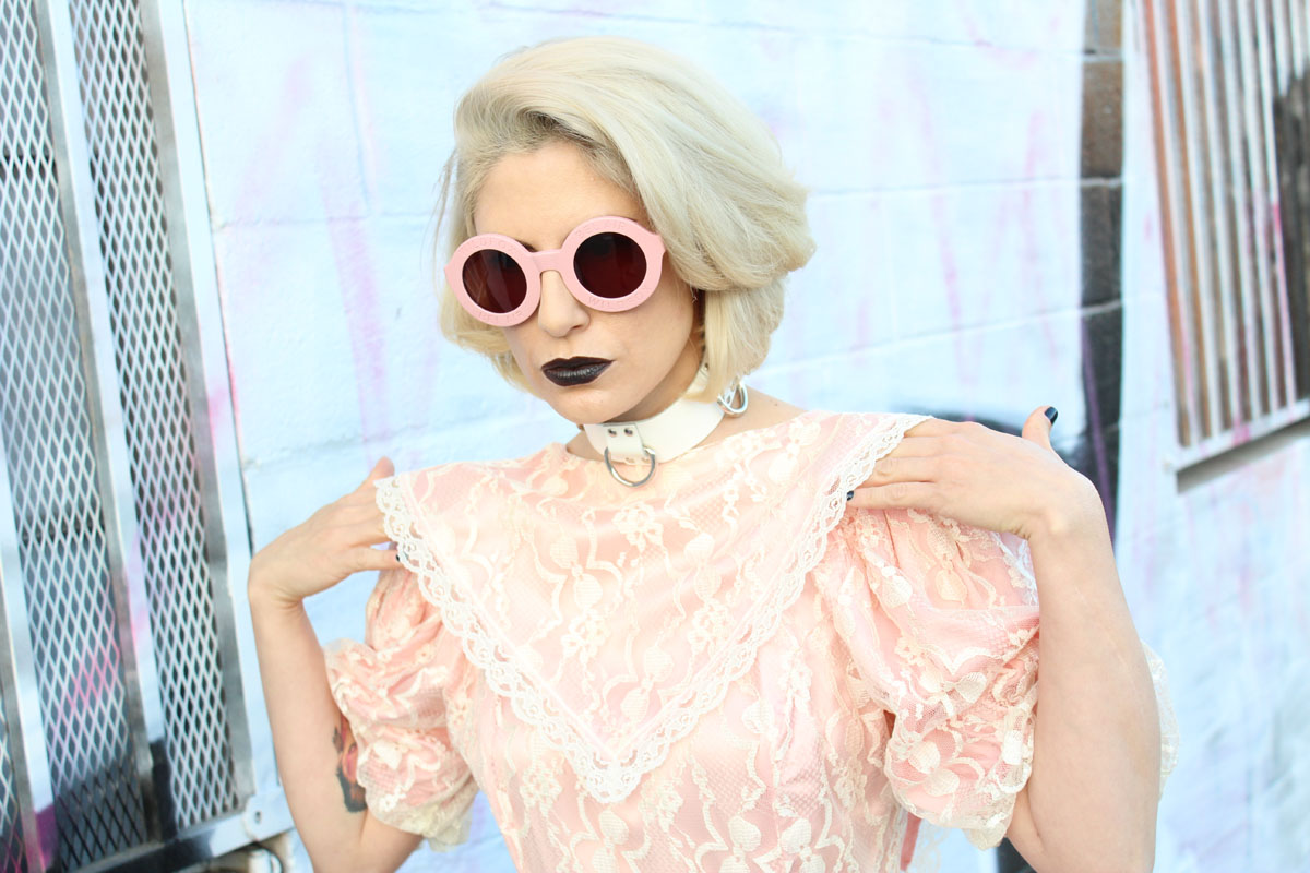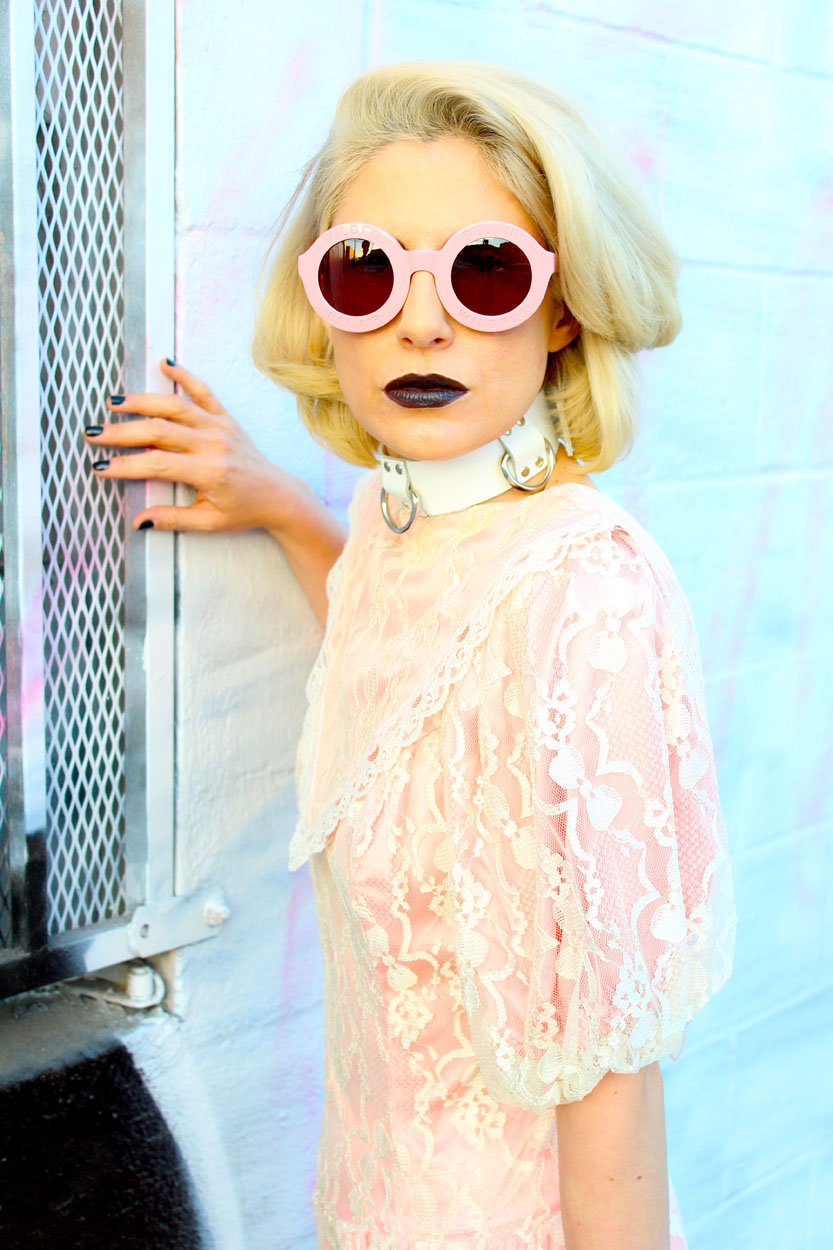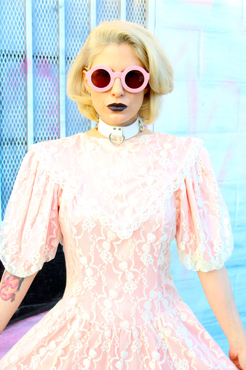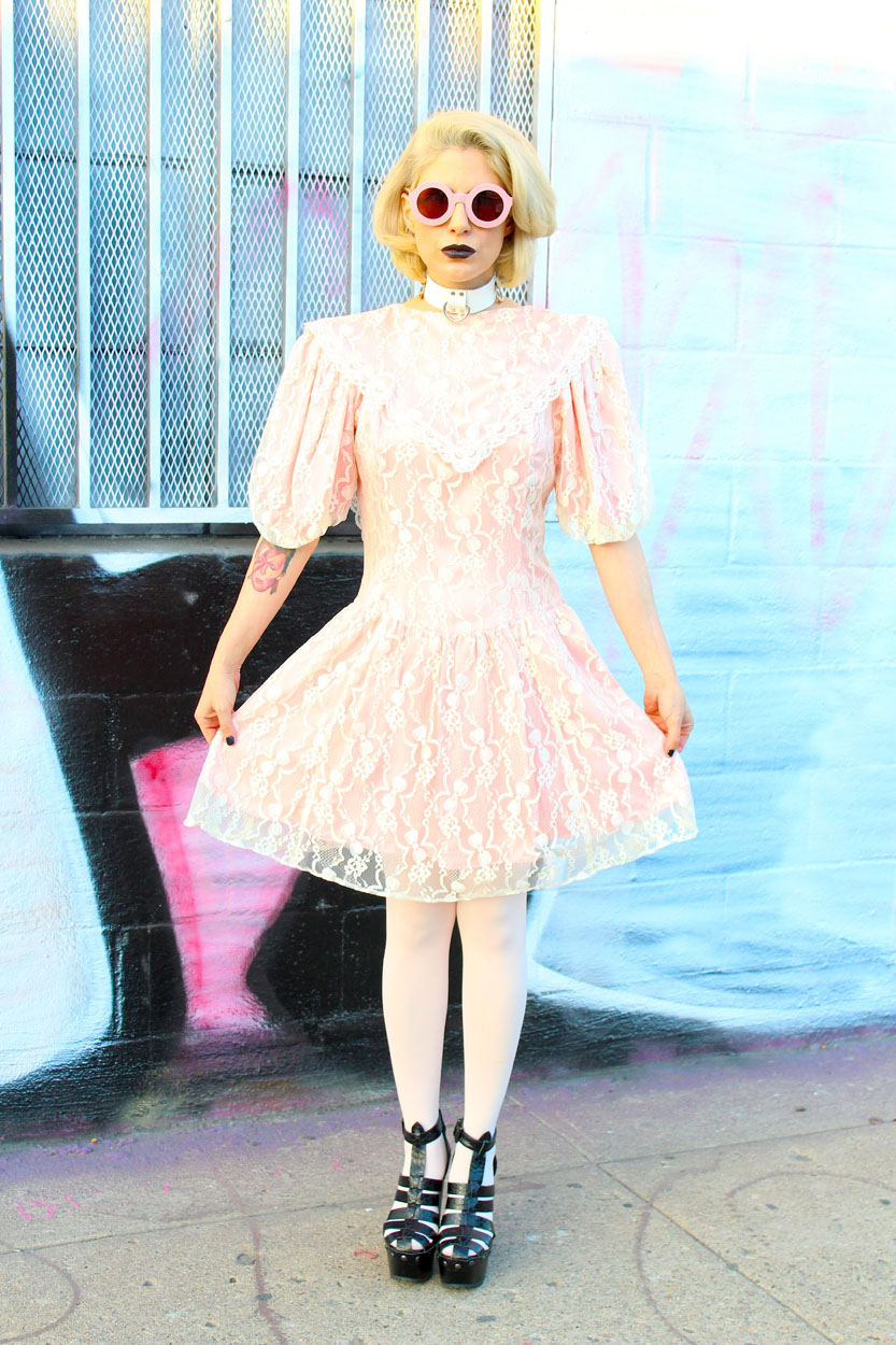 What a killer pale pink Gunne Sax dress featuring a tailored bodice, puff sleeves, with sheer ivory bow lace throughout, a lovely layered collar, and a pretty pink satin lining. Style this gorgeous dress with pink ballet tights, platforms, and your favorite leather jacket. Details like this, were only made for a demonic doll with horrific attitude!