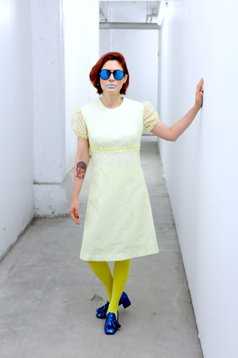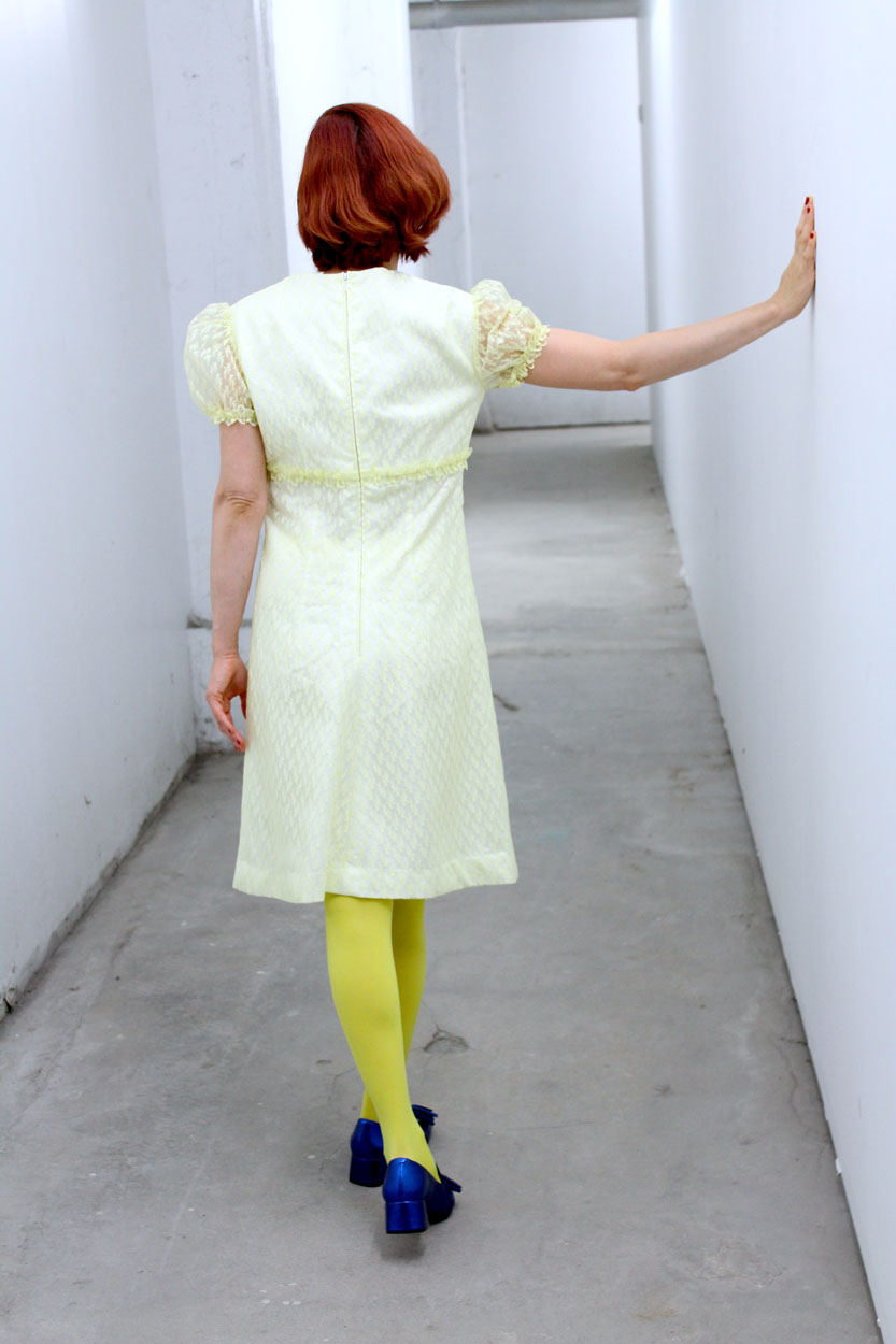Mia Farrow would have definitely danced around in this tasty mod dress! This freshly baked pie dress is made with sweet cream, layered with yellow lace floral trimming, sheer princess sleeves, and a perfect tea length. Pair this delicious dress with colored tights, loafers, retro shades, and faux fur jacket, for a fashion forward. All of the ingredients for an edible editorial look!
