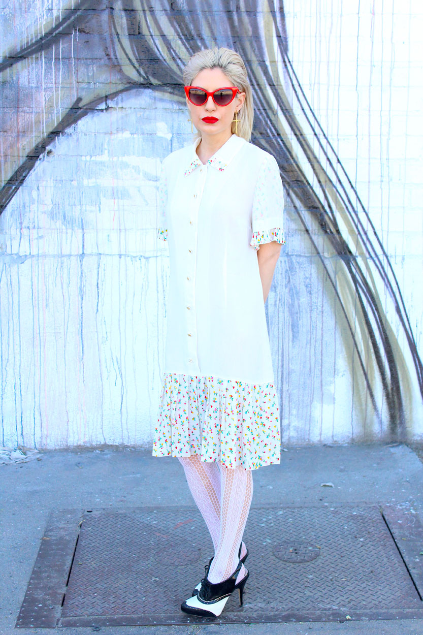 This sweet-ass Japanese dress from the 60s features adorable details, lovely pleating at the skirt & sleeves, floral print throughout the collar, sleeves, & skirt, plus super chic white & gold buttons going down the front. Pair this classic beauty with lace tights, oxfords, and red Lolita shades. Wrap your body in an old Hollywood dream!