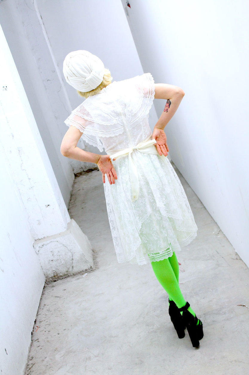 This 80s white Gunne Sax Dress by Jessica McClintock is pure romance featuring a cape collar and a satin white bow in the back. There are just too many sweet-ass layered lace details to even talk about. Style this baby with tights, platforms, 90s shades, and your favorite leather jacket. Take this dreamy little number to the club!