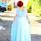 Radiant your inner Frida with folk art style and Mexican culture. This blue chiffon maxi dress is pleated, with an elastic neckline, an embroidered flower, and a long blue ribbon at the waistline. Perfect for any wedding or just brunch with the girls!
