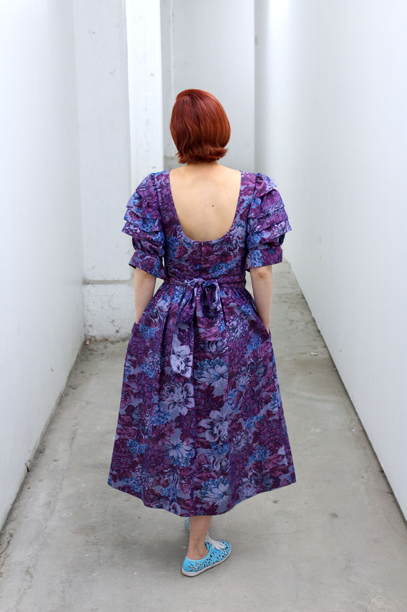 This dreamy little number is blooming with high fashion details, cut with a perfect midi length, a U shaped back, complete with buttons going down the back, 3 layers of ruffles on those dramatic sleeves, and a matching belt included. Pair this floral showstopper with colored tights, chic lace-up ballet flats, and retro shades. A treasure like this deserves a royal garden party!
