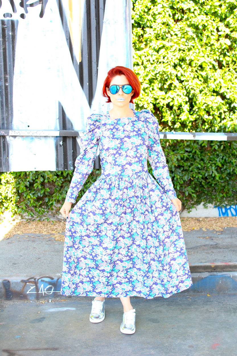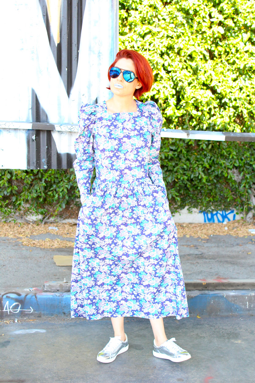 London Country Girls have stolen my heart! This 80s Laura Ashely Dress hails from Great Britain with side pockets and pretty princess sleeves. Style this classic beauty with your favorite kicks or with fierce heels and a moto jacket for a badass evening out!