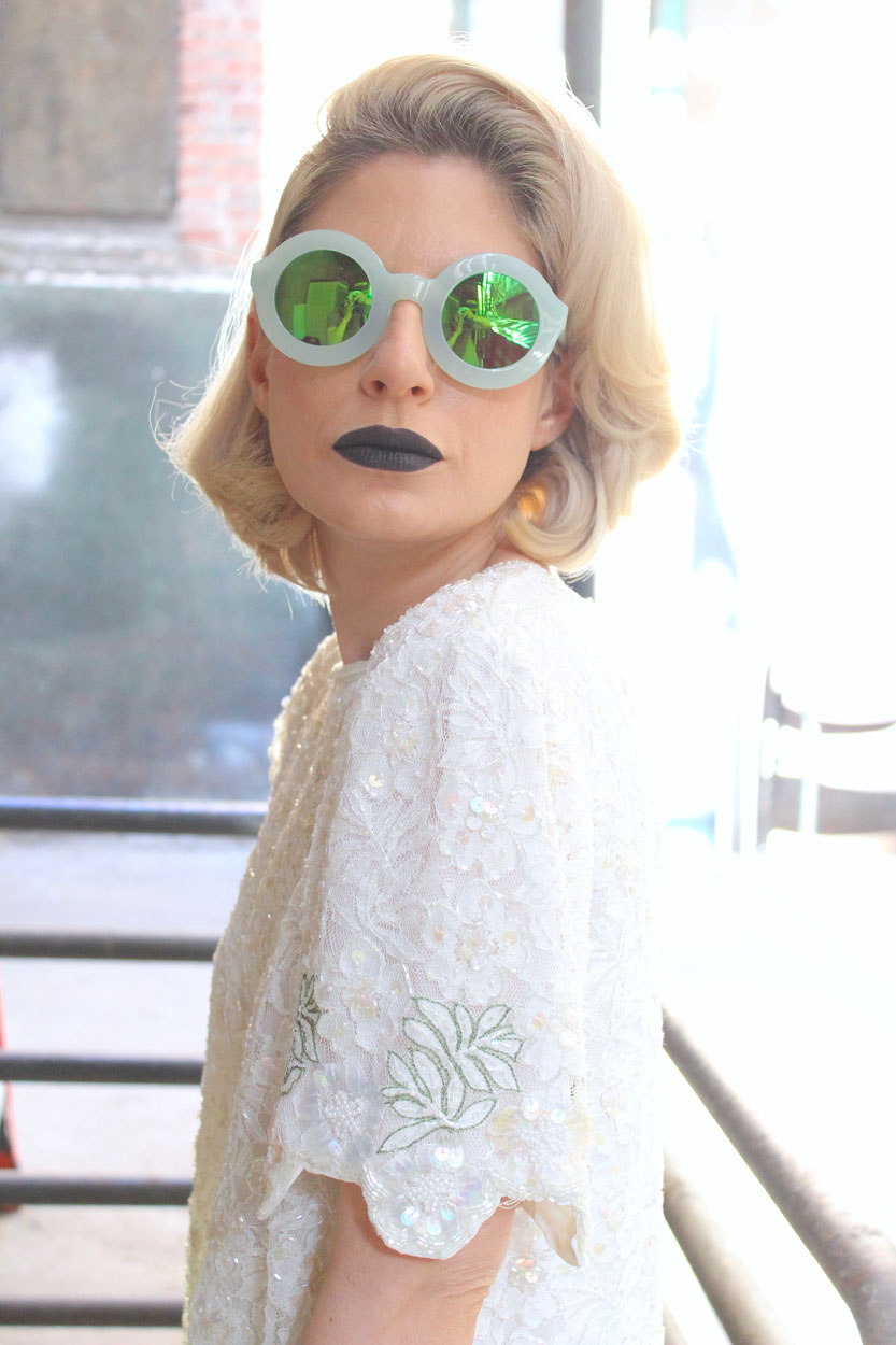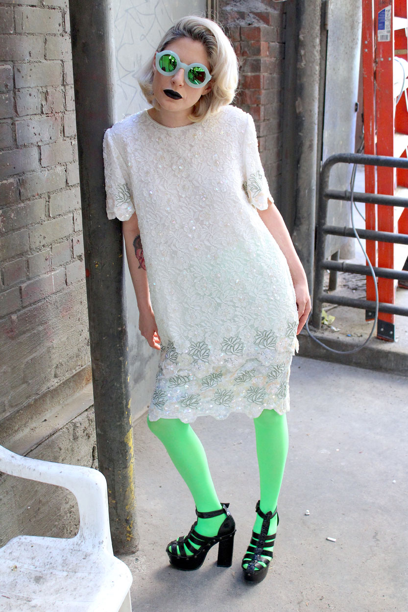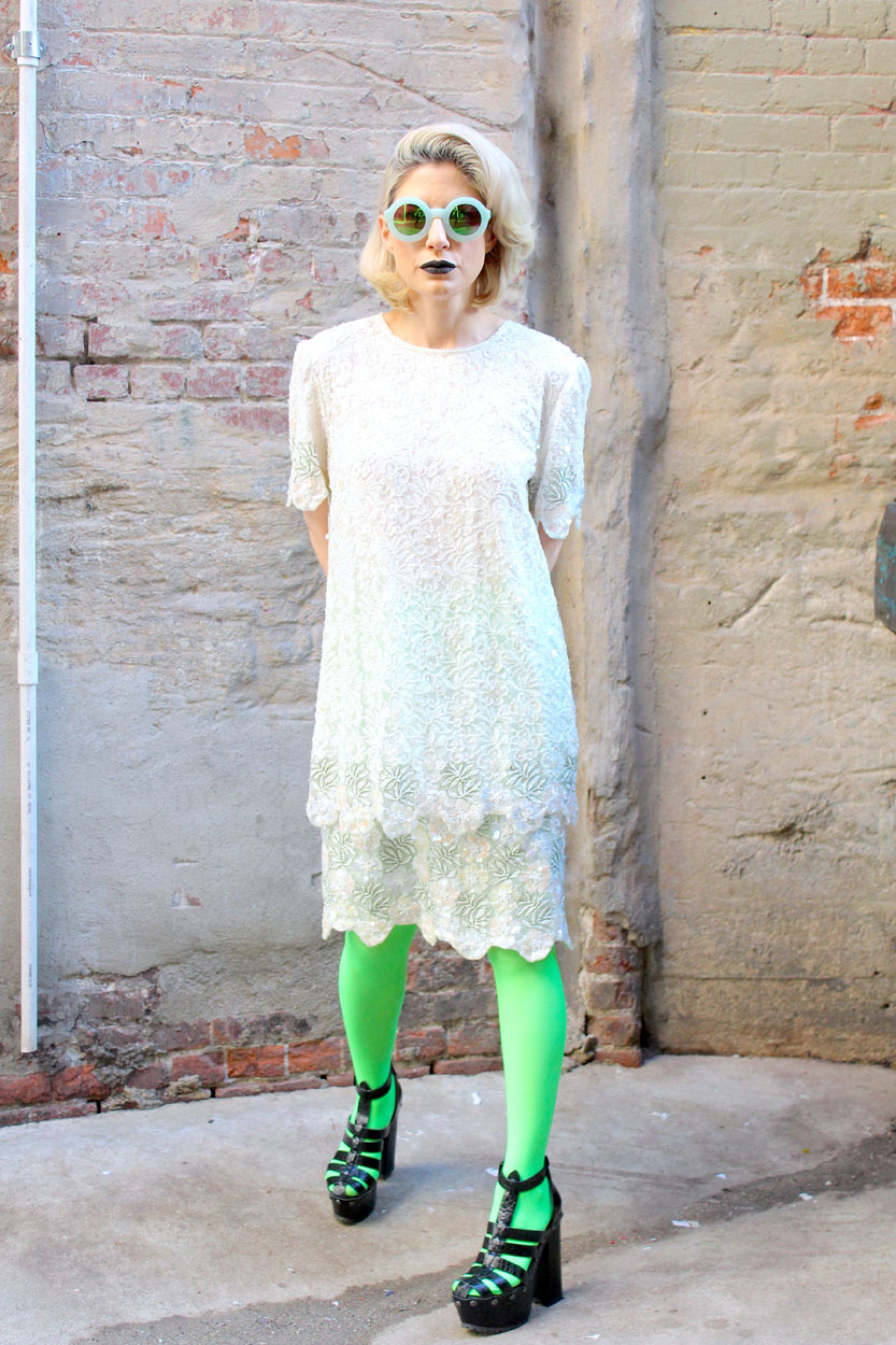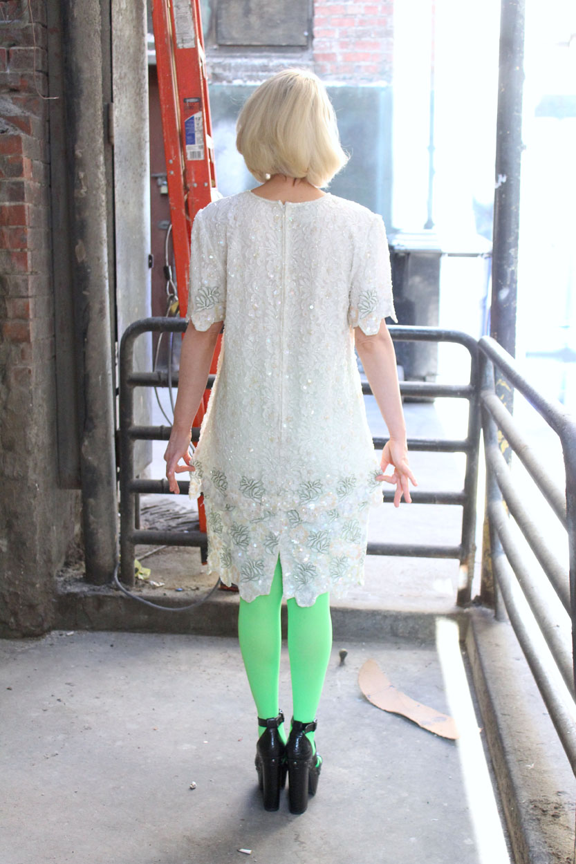 This rare 1940s stunning sequins cocktail dress features floral off white beading throughout, tiered layered sequins, scalloped trimming throughout, zipper in the back, plus green floral sequins along the edges. Pair this elegant number with tights, pretty pumps, and a classic faux fur jacket. Truly unbelievable details for a sequin dress!