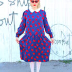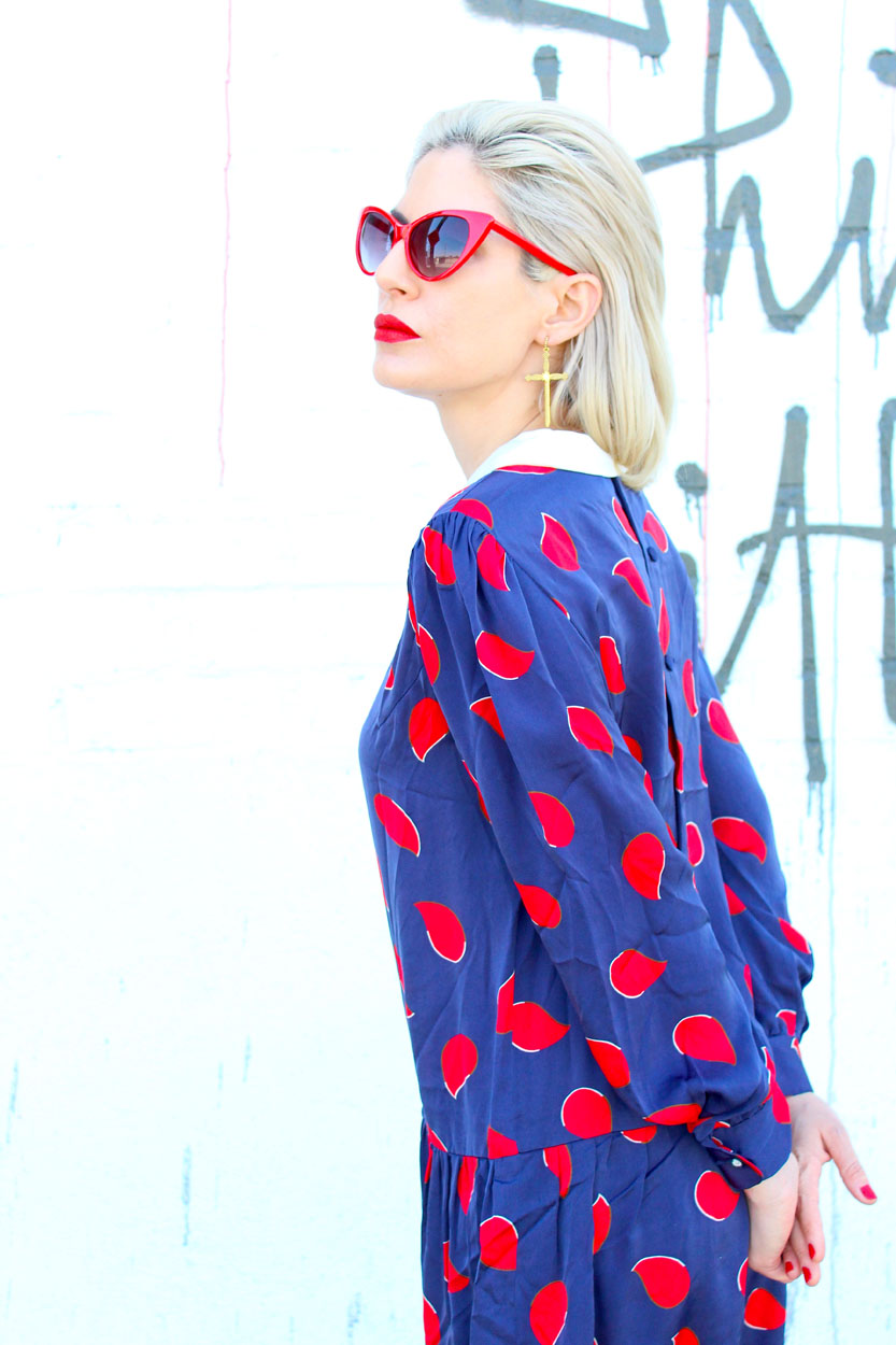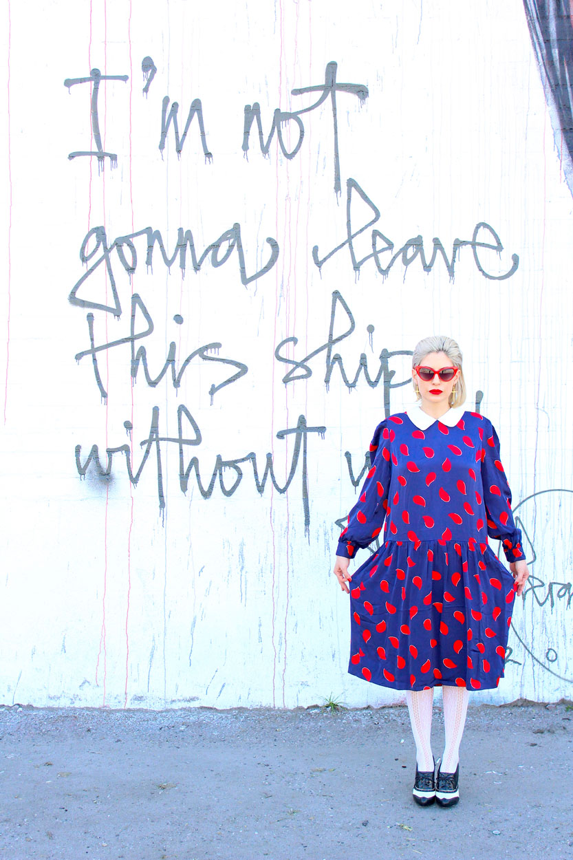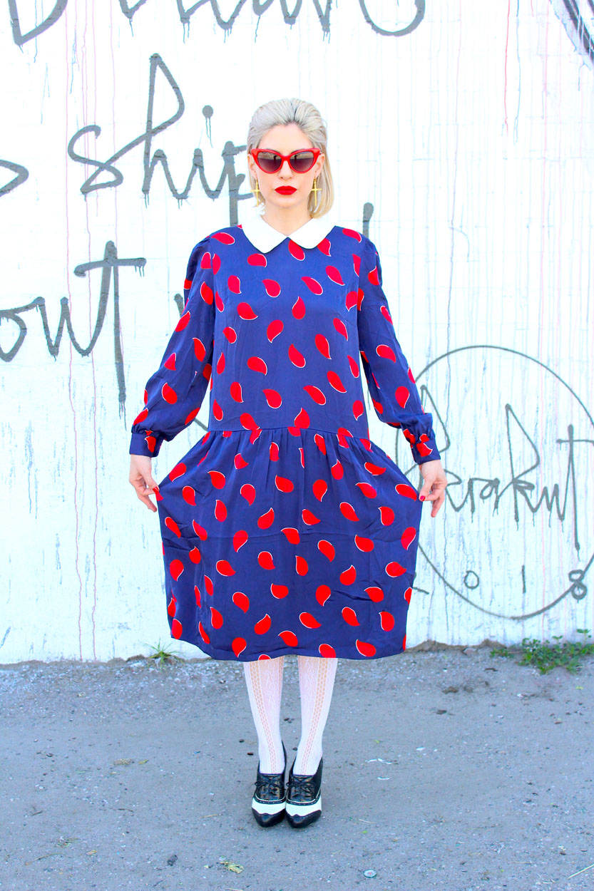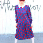 This 80s rockabilly dress is a bright navy blue silky print, featuring a pretty red paisley print throughout, a classic peter pan collar, long sleeves, drop waist, covered buttons going down the back, plus it’s fully lined. Rock this sweet-ass swingers dress with lace tights, red Lolita shades, loafers, and your favorite leather jacket. It’s time to get shipwrecked with the love of your life!