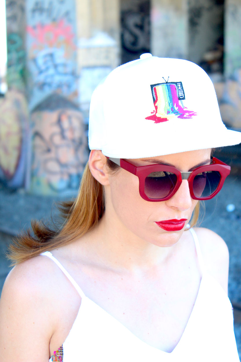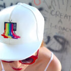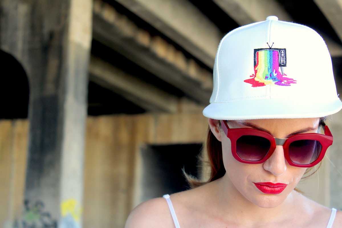 My PRIDE Collection are limited edition pieces! Step into the future with this vibrant white vegan leather hat embroidered with rainbows melted from a TV, inspired by the 90s MTV generation melting away. This entire collection was made with PRIDE in the heart of Downtown Los Angeles just you!