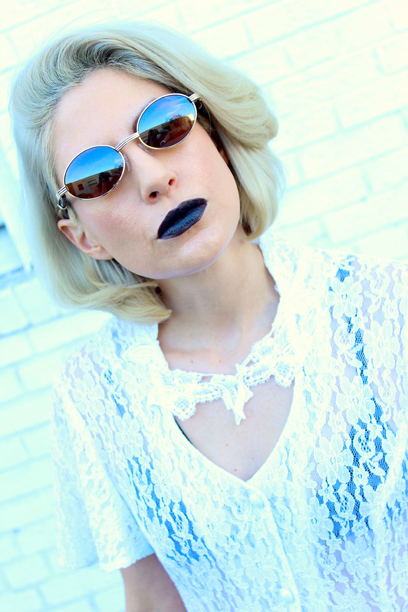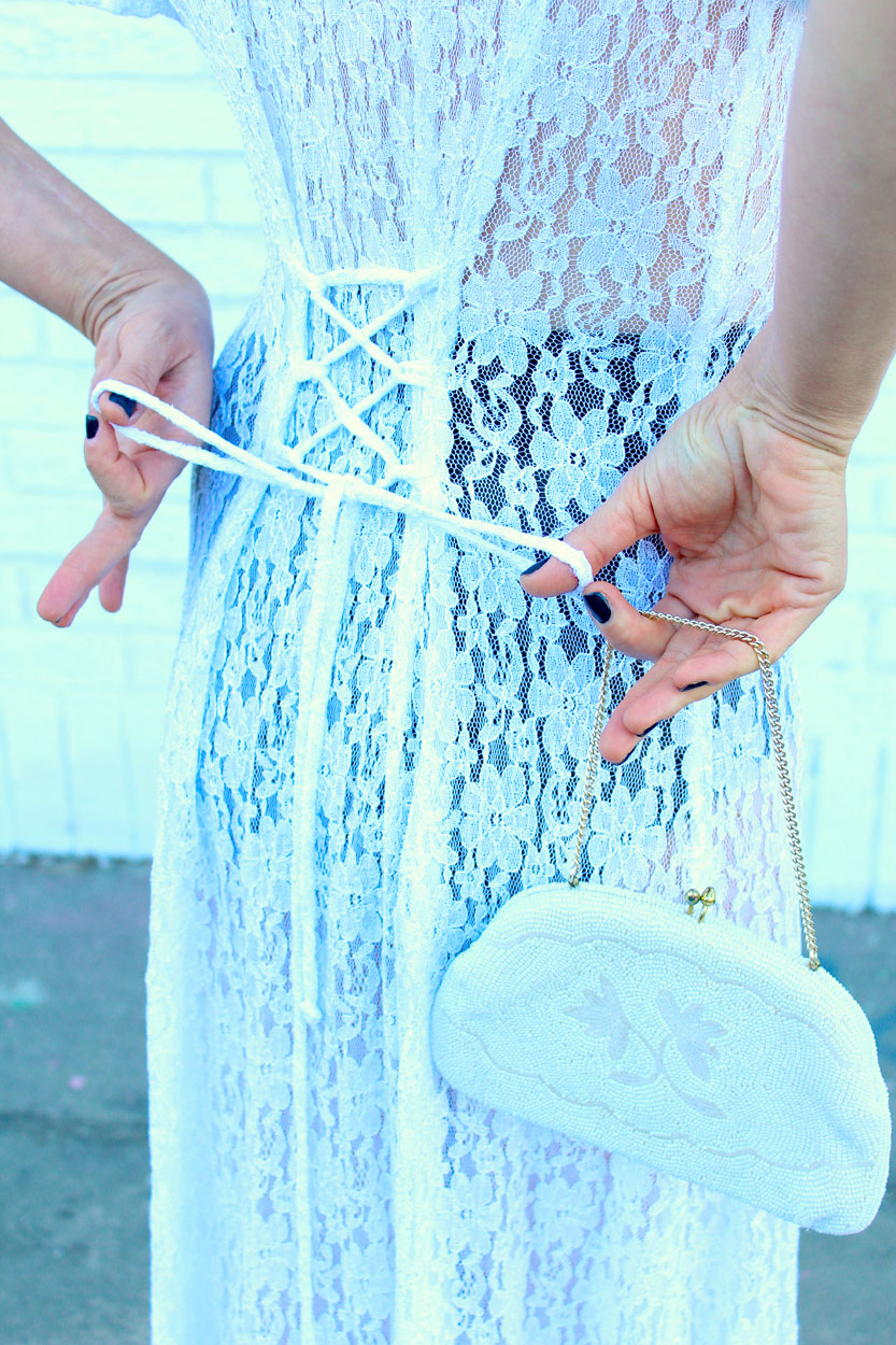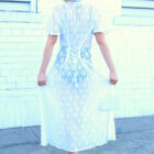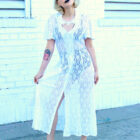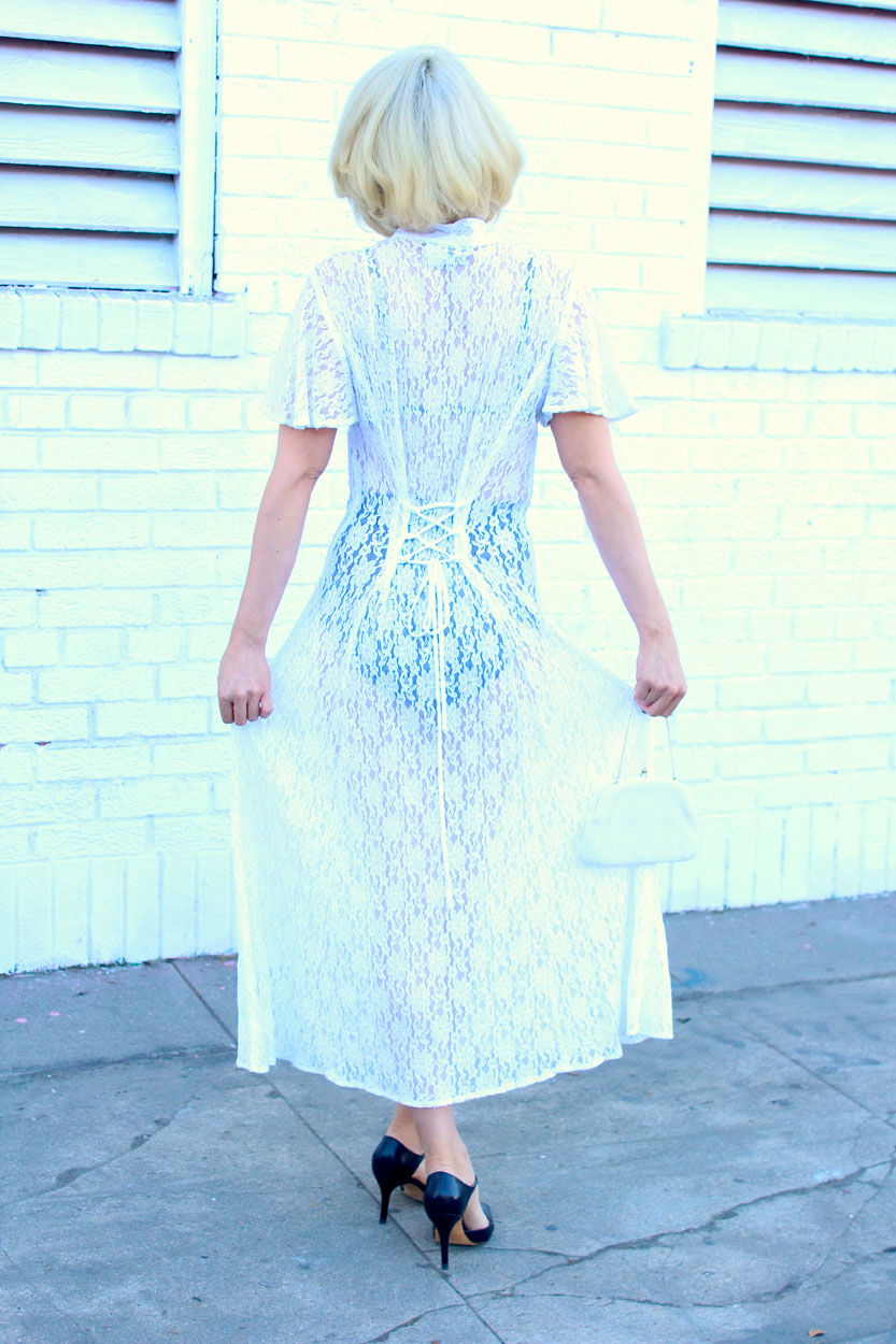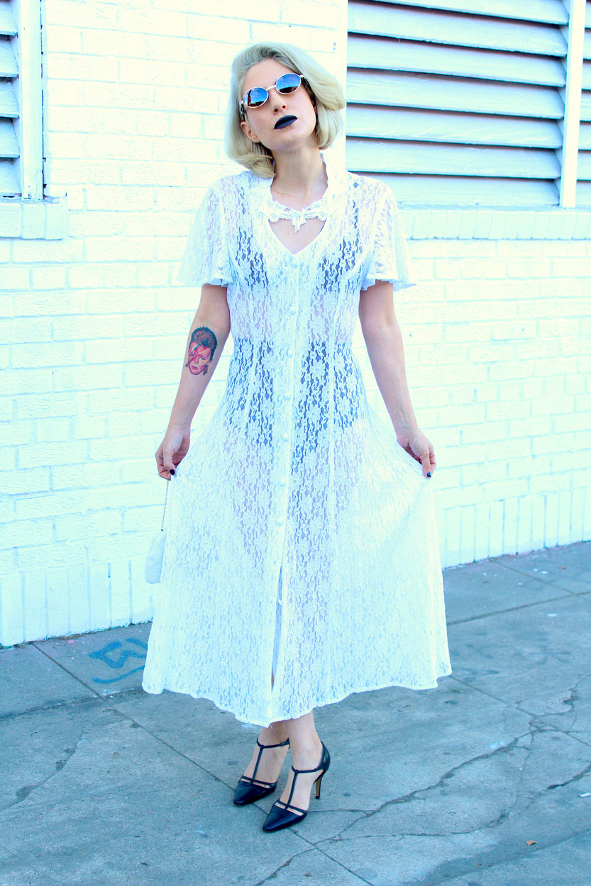This dreamy sheer lace dress features a flowy floral silhouette, a heart-shaped cut out at the chest, white buttons going down the front, and an adjustable corset lacing at the back. Pair this lovely number with classic Manolo heels, high waisted panties & a bralette, and your favorite leather jacket. Real romance begins after midnight!