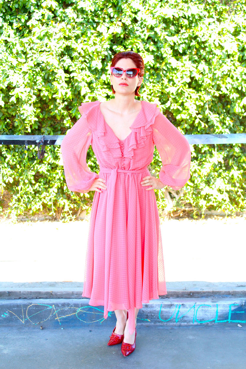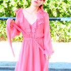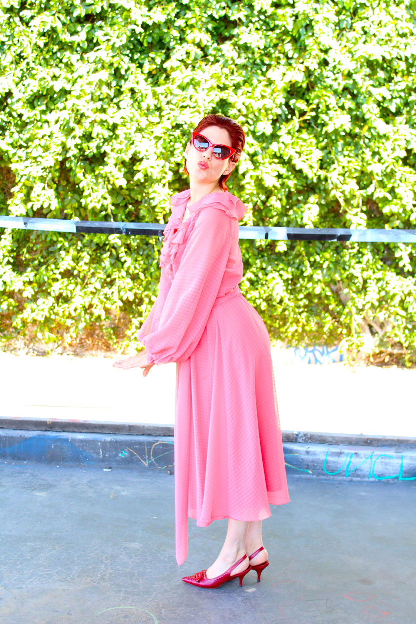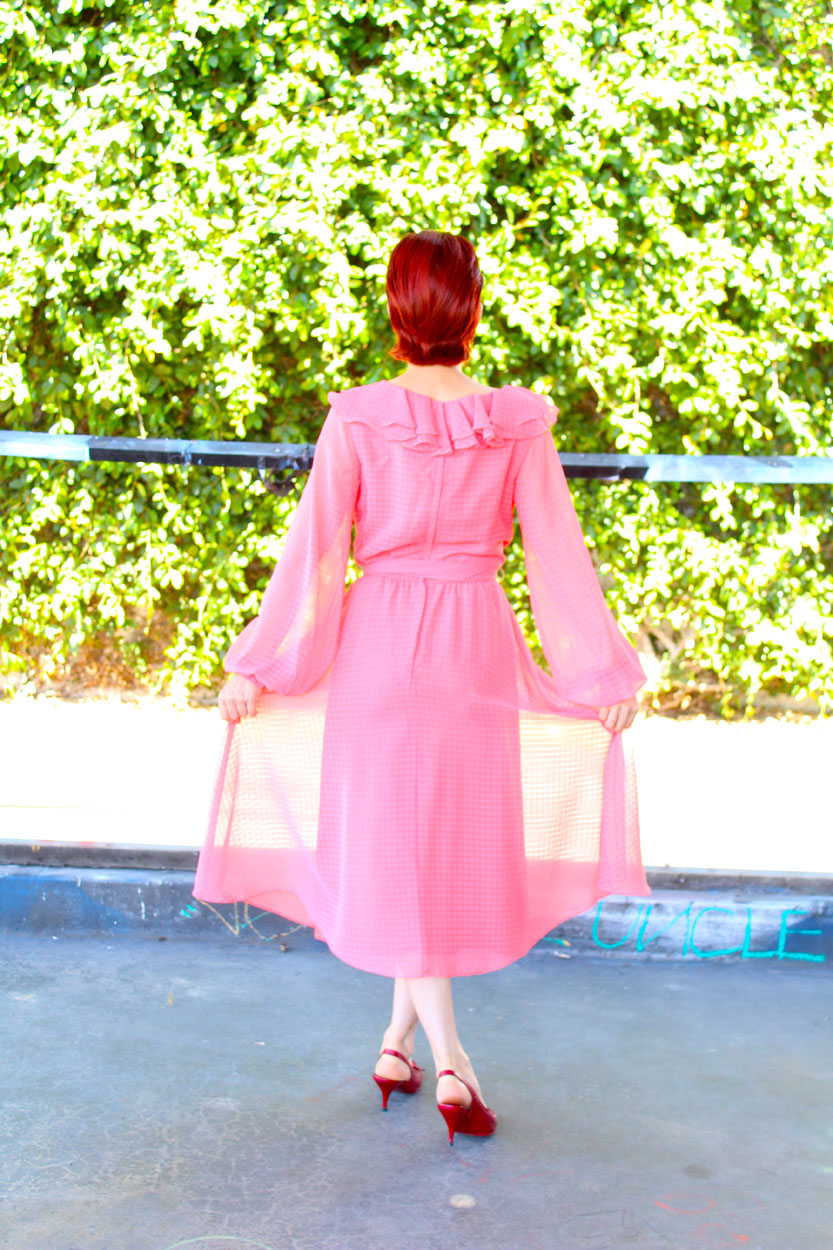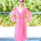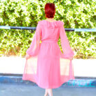 Give me some of that warm delicious peach pie! This 70s melon dress is made in a box pattern of ruffle chiffon, complete with a long matching sash belt, sheer sleeves, plus it’s fully lined. To brighten up your evening out, pair this elegant cocktail dress with heels and your favorite leather jacket!
