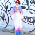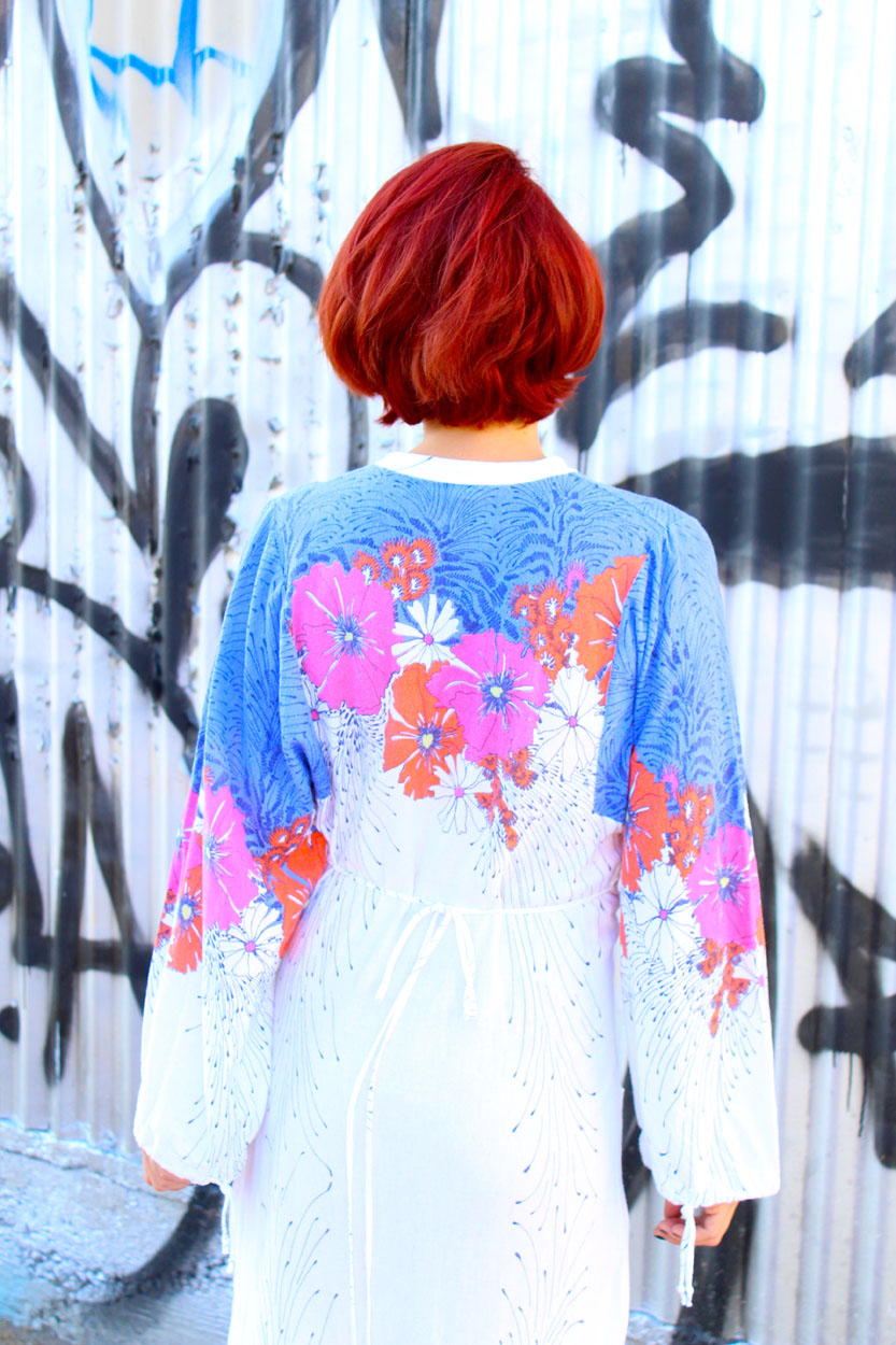 Headed to your next luxury resort?! This 70s boho maxi dress is a must, when packing for those classic vacation vibes. It’s made in a lightweight stretch cotton, semi sheer, complete with thin ties at the neckline and rear, beautiful balloon sleeves, and a bold floral print throughout. Rock this beachy flower power dress over your favorite bikini!