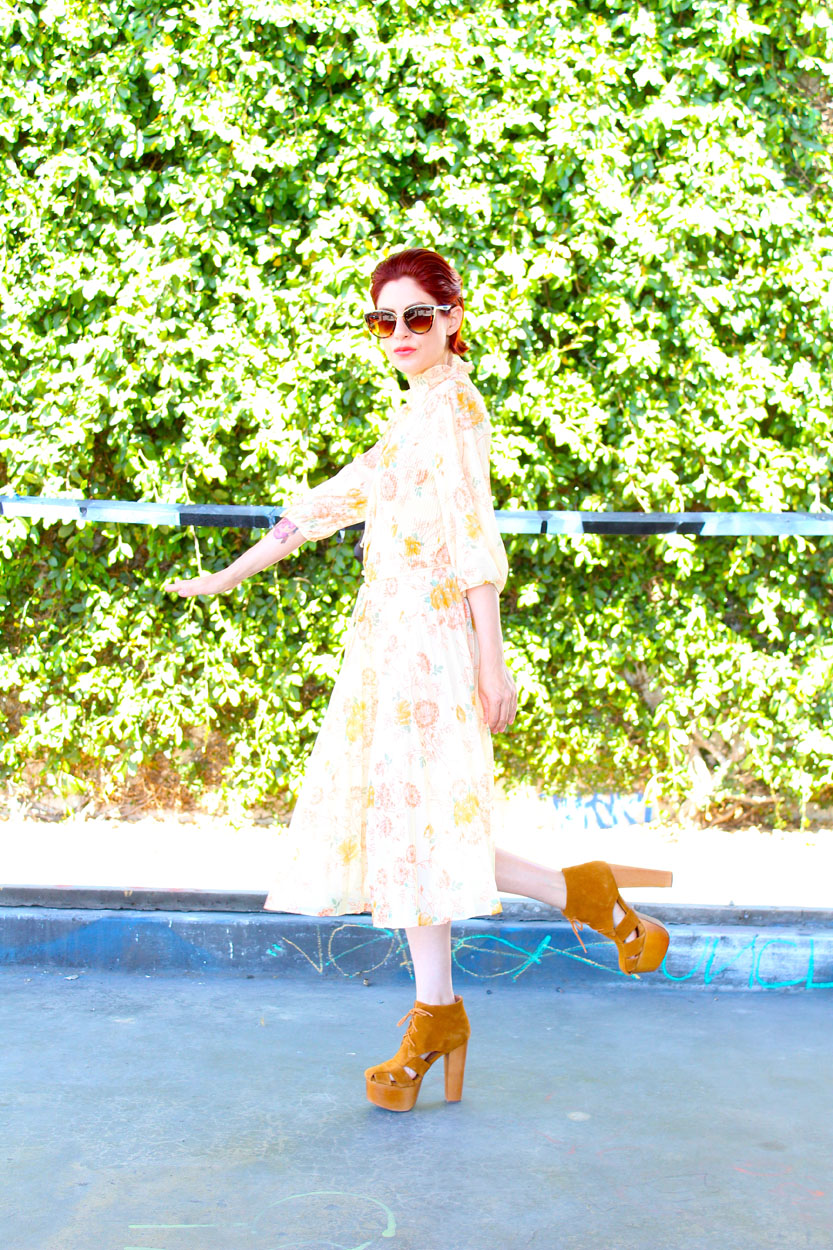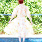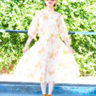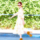 Asian inspiration is ideal for true style junkies! This pale yellow beauty has a sheer floral print throughout, pleated, with thin ties at the neckline and waist. To achieve that Gucci romance, all you need are high waisted under garments, circle shades, suede mules, and a classic faux fur jacket!