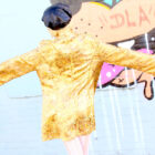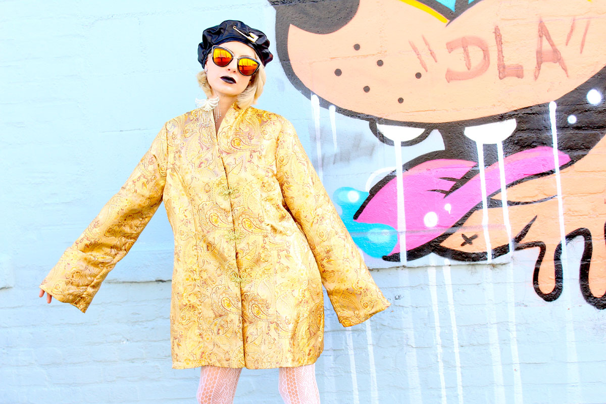 The ultimate golden party dress, featuring metallic brocade details throughout and golden frog closures. This elegant kimono can be paired with chandelier earrings, lace tights, suede platforms, and a classic faux fur jacket. Rock that Asian influence “the way Edie would” this holiday season!